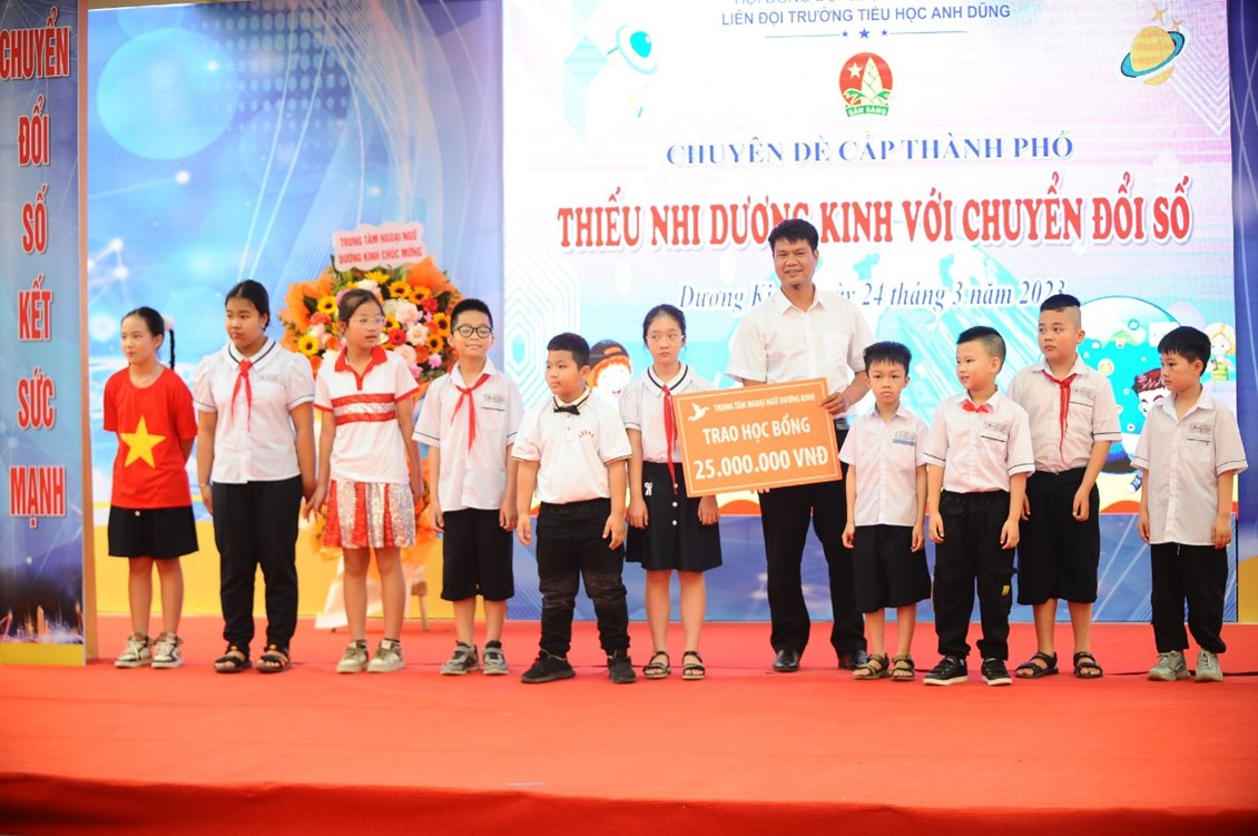 Tại chuyên đề, Trung tâm Ngoại ngữ Dương Kinh trao tặng 15 suất học bổng tiếng Anh trị giá 25 triệu đồng cho các em học sinh xuất sắc.