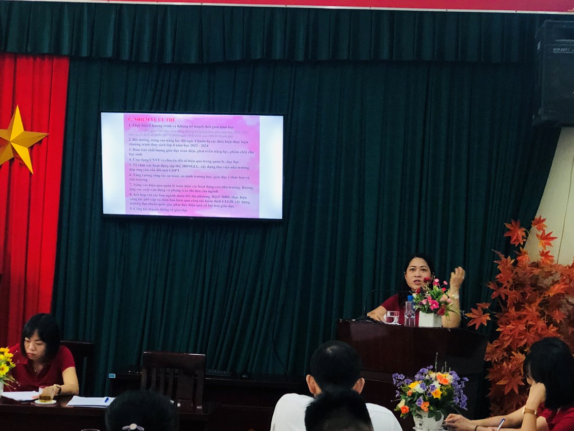 Đại diện Đoàn chủ tịch, đồng chí Đỗ Thị Thanh - Bí thư chi bộ, Hiệu trưởng nhà trường, thông qua báo cáo đánh giá kết quả thực hiện Nghị quyết Hội nghị CBCCVC năm học 2021-2022, triển khai phương hướng nhiệm vụ năm học 2022-2023.